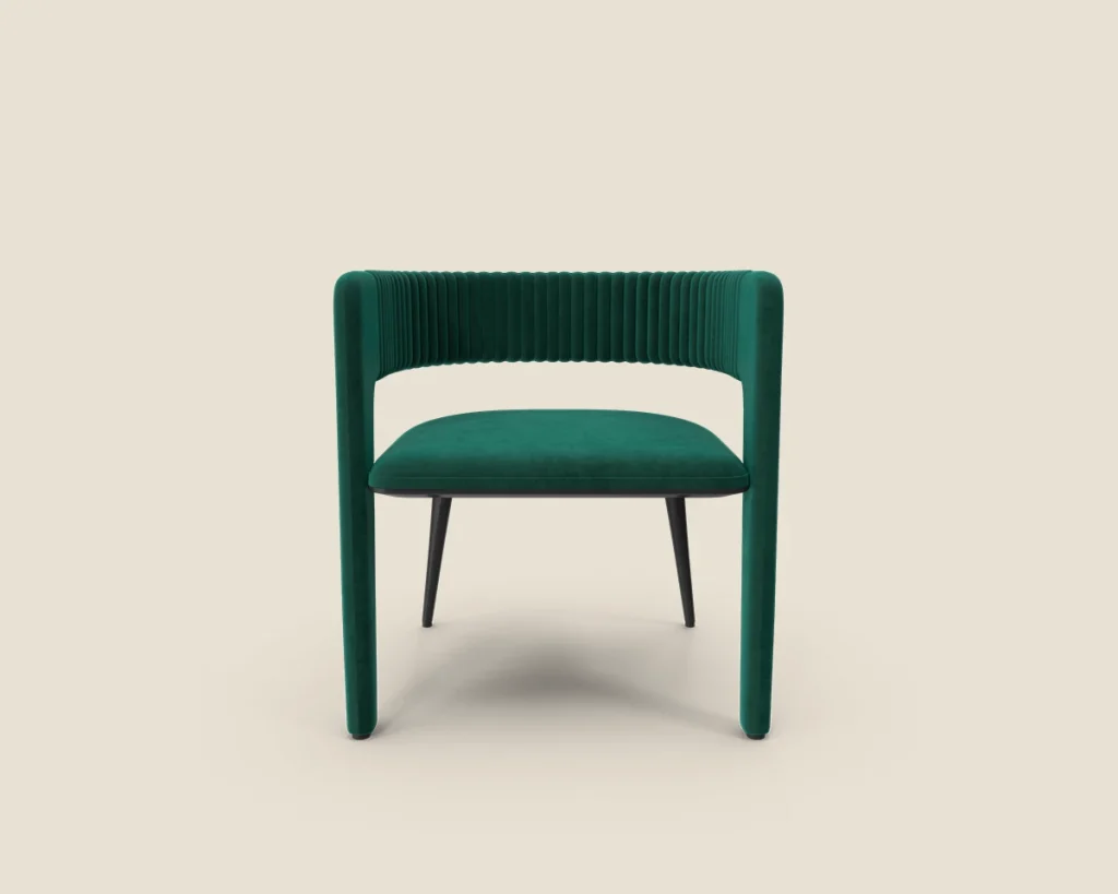 The Velvet Curve chair features a luxurious velvet finish, ribbed detailing, and a sleek modern design, making it perfect for adding a stylish touch to any room.