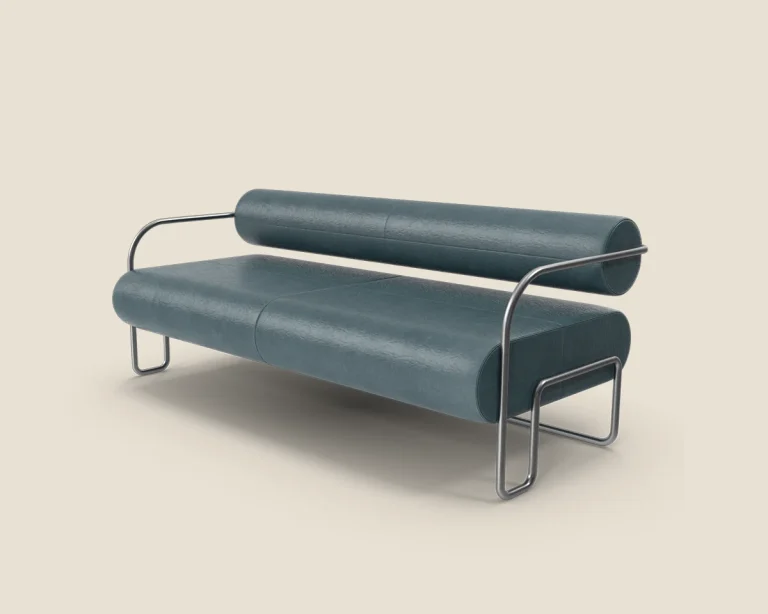 A contemporary sofa featuring a sleek metal frame and plush cushions, offering both style and comfort for modern spaces.